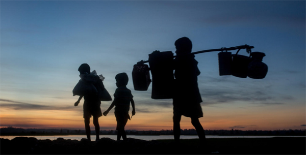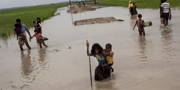 Người tị nạn Rohingya tại Myanmar di chuyển qua những cánh đồng lúa ngập nước, chạy trốn qua biên giới quận Cox's Bazar, Bangladesh. Nhiều đứa trẻ bị sốt vì lạnh do phải ngâm mình dưới nước quá lâu và không có quần áo để thay.