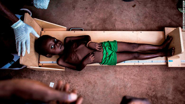 Bạo lực chính trị quân sự kéo dài nhiều năm tại khu vực Kasai, Cộng hòa dân chủ Congo, đã khiến hơn 850.000 trẻ em phải sơ tán, hơn 200 trung tâm y tế và 400 trường học bị tấn công, khoảng 350.000 trẻ em bị suy dinh dưỡng nghiêm trọng. Trong ảnh, một đứa trẻ đang được đo chiều cao, cân nặng tại bệnh xá chuyên điều trị suy dinh dưỡng ở Kasai.