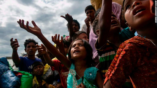 Tại Myanmar, những đứa trẻ theo Hồi giáo, thuộc dân tộc thiểu số Rohingya đã bị tấn công bạo lực và phải chạy trốn khỏi nhà ở bang Rakhine, nơi bạo lực do mâu thuẫn sắc tộc và chia rẽ giữa cộng đồng Phật giáo và người Rohingya theo Hồi giáo đang diễn ra. Hơn một nửa trong 650.000 người Rohingya phải vượt biên qua Bangladesh tị nạn là trẻ dưới 18 tuổi. Trong ảnh là những đứa trẻ Rohingya đang giơ tay xin ăn ở Bangladesh.