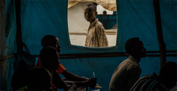 Tính đến tháng 4/2017, Nam Sudan là nước có tỷ lệ trẻ em không đi học cao nhất thế giới, trong đó có gần 72% trẻ em bỏ học ngay từ bậc tiểu học. Trong ảnh là một đứa trẻ đang đứng từ cửa sổ nhìn vào lớp tiểu học do tổ chức Bảo vệ người dân (PoC) tại Nam Sudan dựng nên.