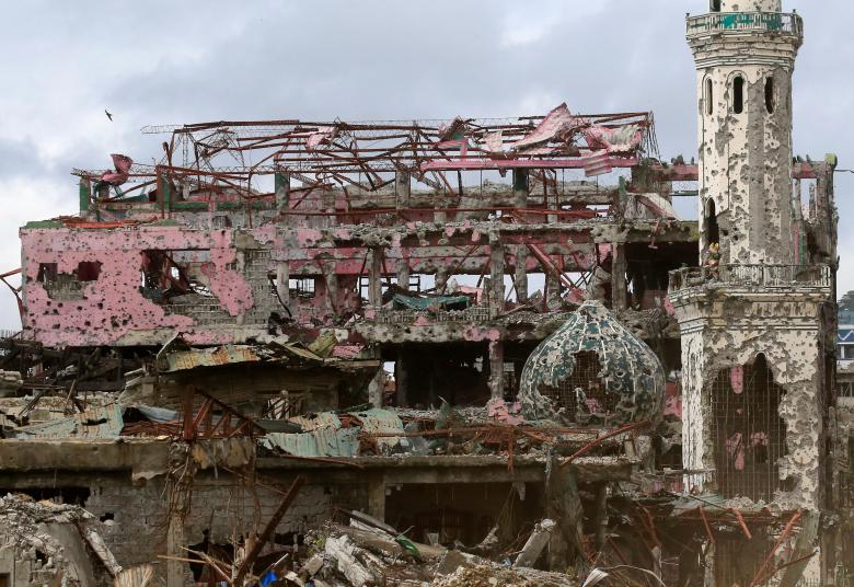 Nhà cửa và một nhà thờ bị phá hủy hoàn toàn tại thành phố Marawi, Mindanao (Philippines) sau cuộc giao tranh giữa quân đội chính phủ và phiến quân khủng bố Maute có liên hệ với IS ngày 25/10.