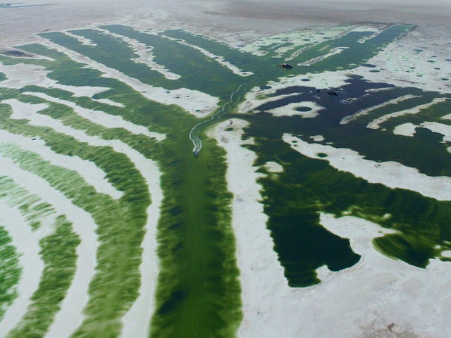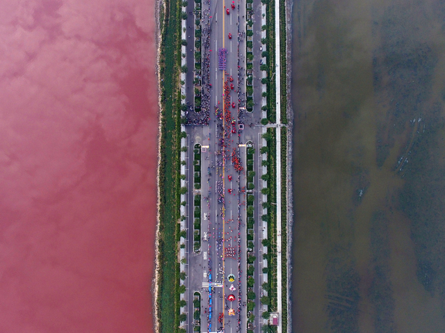 Nhờ tảo mà ta có thể chứng kiến sự tương phản màu sắc rực rỡ của hồ muối này, vốn càng rõ hơn khi được chia cách bởi một con đường ở Vận Thành, Trung Quốc.