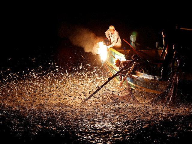 Những ngư dân ở Thành phố Tân Bắc, Đài Loan, đang ở trong một chiếc thuyền đánh cá bằng lửa lưu huỳnh. Phương pháp độc đáo này sử dụng lửa để thu hút cá.