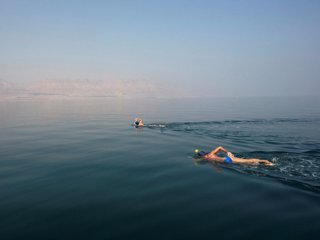 Được chụp ở Kibbutz Ein Gedi, Israel, những kình ngư này đang bơi tới bờ biển Israel từ Jordan trong sự kiện Bơi Qua Biển Chết. Sự kiện này làm tăng nhận thức về các mối đe dọa về sinh thái đối với Biển Chết.
