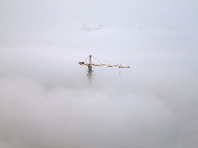 Chiếc cần cẩu đơn độc vươn ra từ màn sương mù dày đặc vốn nhấn chìm thành phố cảng Yên Đài thuộc tỉnh Sơn Đông của Trung Quốc.