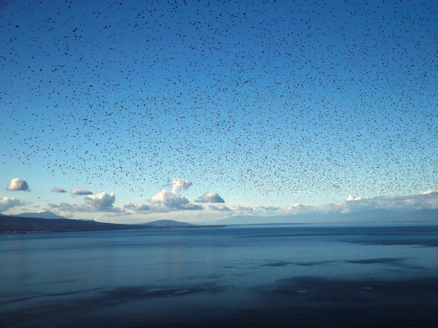 Một đàn chim sáo điểm xuyết bầu trời trên hồ Leman ở Lavaux, Thụy Sĩ.