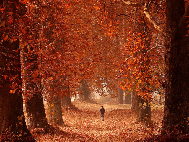 Mùa thu ngập tràn trong từng bước đi của người đàn ông này, qua khu vườn ở Srinagar, Kashmir.