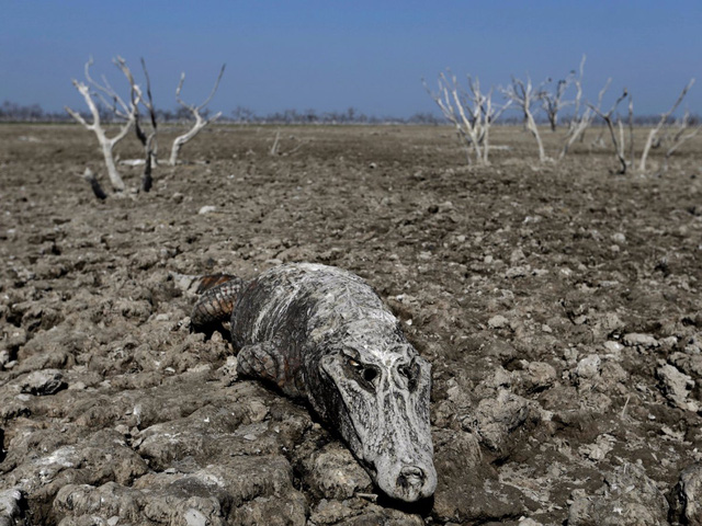 Xác một con cá sấu đã khô cong được tìm thấy gần sông Pilcomayo ở Boqueron, Paraguay.
