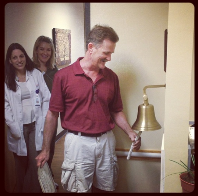 11. Người đàn ông gõ chuông để báo hiệu cuộc chiến chống ung thư của ông đã kết thúc. Nụ cười hạnh phúc của cả bệnh nhân, người nhà và bác sĩ cho thấy kết quả điều trị tốt đẹp đến nhường nào.