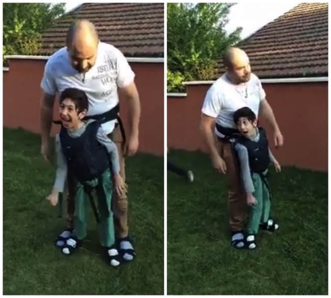 12. Người cha buộc cậu con trai khuyết tật vào người để em có thể được chơi bóng. Chỉ có cha mẹ mới là những người không quản ngại khó khăn để con có được những giây phút vui vẻ.