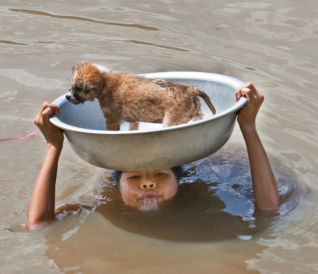 8. Bé gái cứu chú chó con khỏi cơn bão lũ. Người em có thể ướt như chuột lột, nhưng chú chó thì không vì vậy em đã đặt chú chó lên đầu vượt lũ tìm nơi trú ẩn an toàn cho cún con.