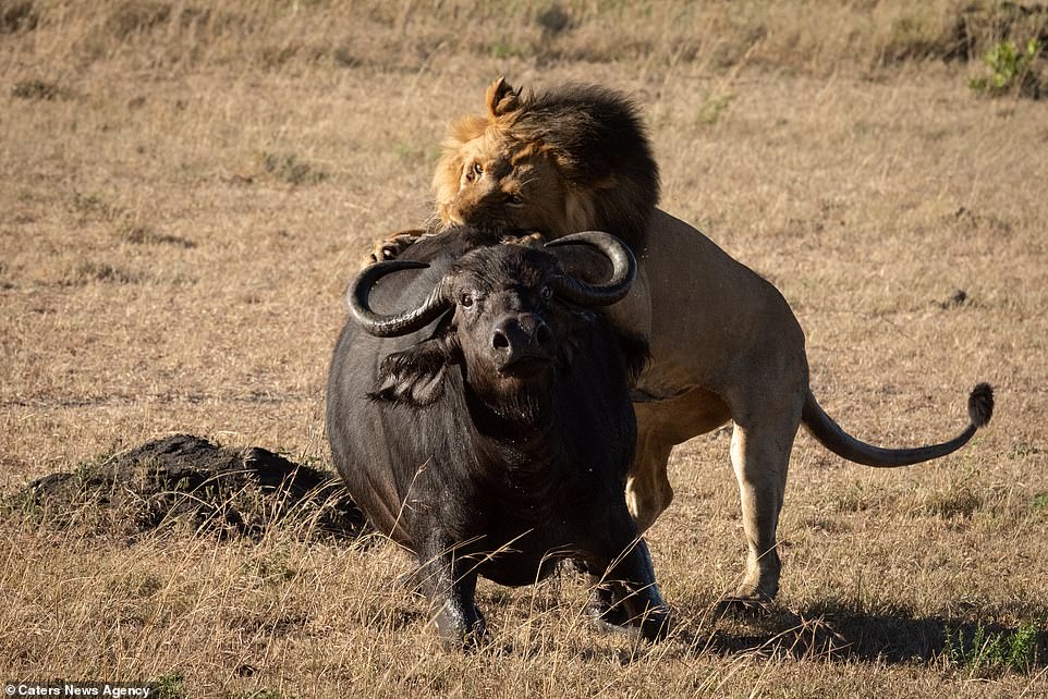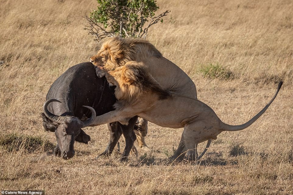 Chuỗi hình ảnh cho thấy một con sư tử đang vồ lên con trâu cái từ phía sau, rồi 2 con sư sử khác đến giúp sức. Khi cả 3 “thợ săn” hoang dã chuẩn bị hạ gục con mồi xuống đất, một con sư tử thứ tư đến tham gia “bữa tiệc”. Cuối cùng, cả đàn “thợ săn” xếp hàng và thưởng thức chiến lợi phẩm của mình.