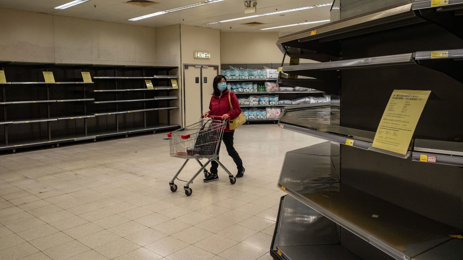 Một người phụ nữ hoang mang nhìn kệ hàng trơ trọi tại một siêu thị ở Hong Kong, ngày 9/2.