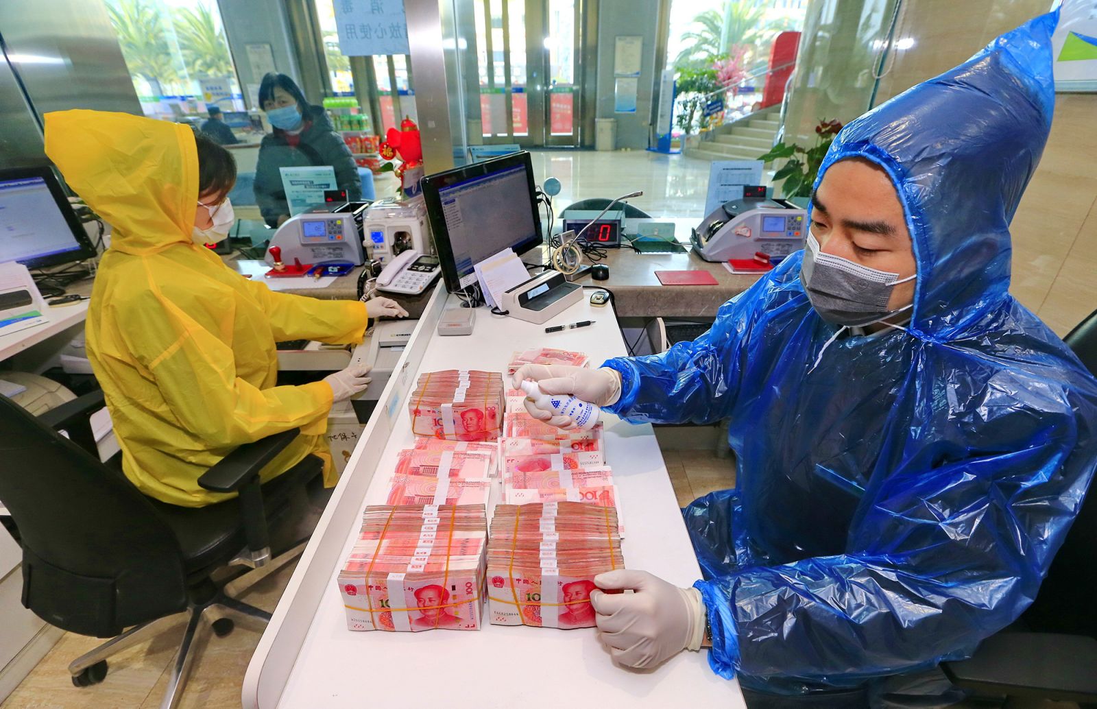 Nhân viên ngân hàng đang khử trùng tiền giấy ở tỉnh Tứ Xuyên, Trung Quốc hôm 26/2.
