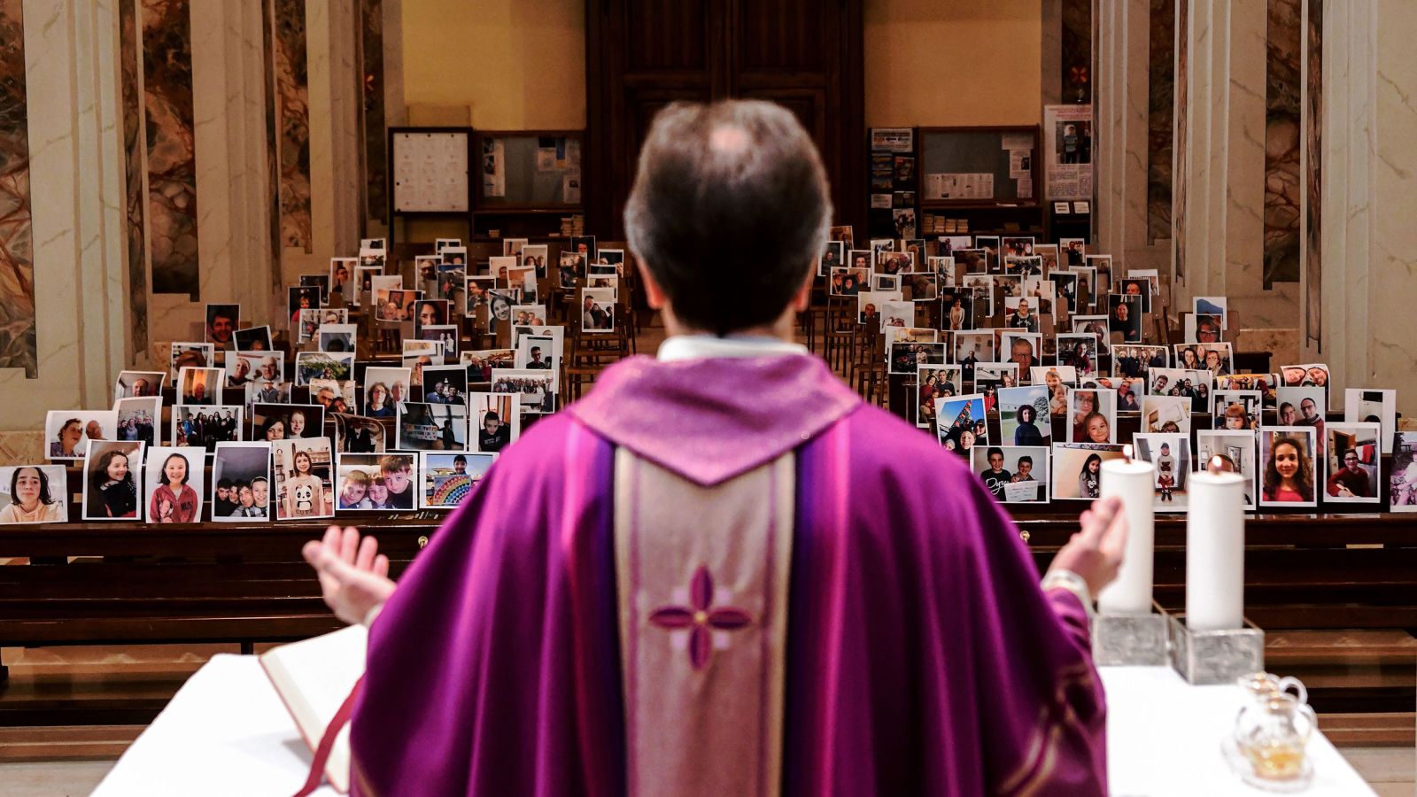 Giuseppe Corbari tổ chức Thánh lễ ngày Chủ nhật ở Giussano, Ý với sự tham gia của các tín đồ qua ảnh chụp. Vì đảm bảo an toàn cho mọi người mà nhiều nghi lễ tôn giáo phải tổ chức trực tuyến.