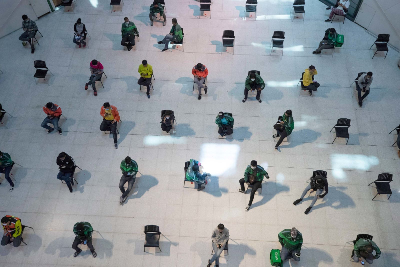 Các nhân viên giao hàng giữ khoảng cách trong lúc chờ đợi mua thức ăn tại một trung tâm mua sắm ở Bangkok, Thái Lan ngày 24/3.