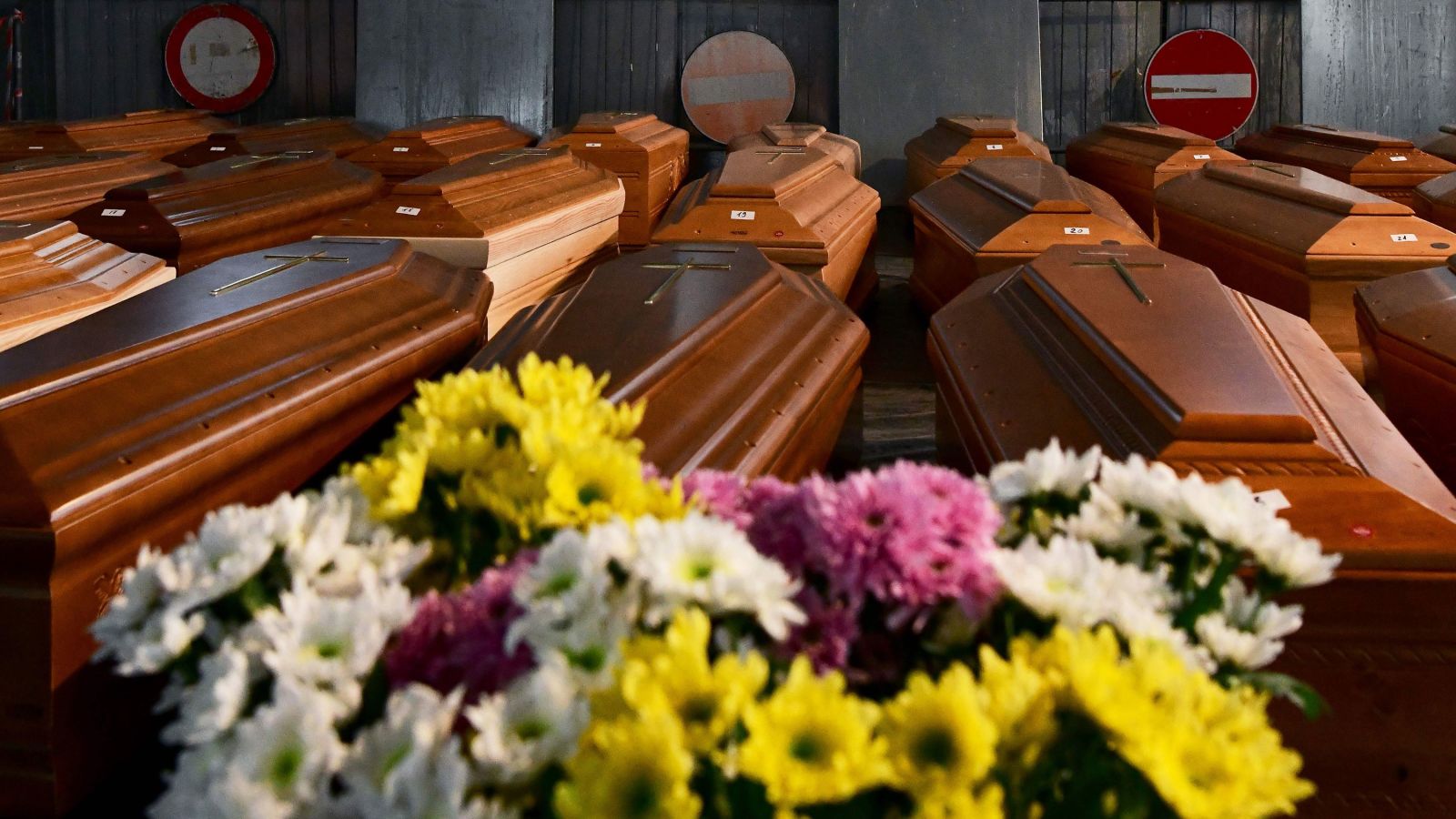 Quan tài chứa thi thể bệnh nhân COVID-19 đặt tại một nhà kho ở Ponte San Pietro, Ý hôm 26/3, chuẩn bị đưa đi hỏa táng.