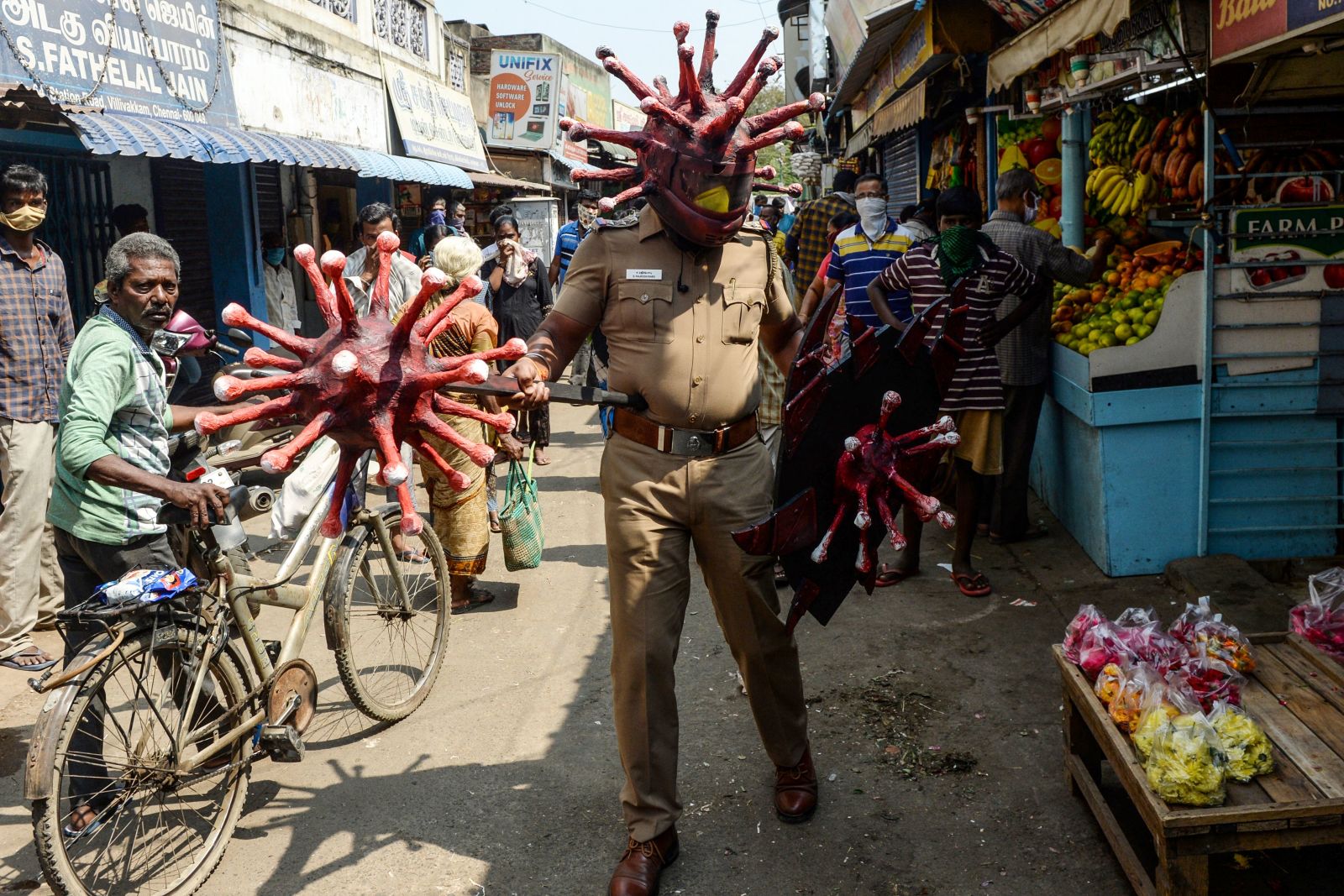 Một sĩ quan cảnh sát đội chiếc mũ hình virus corona đi vào chợ ở Chennai, Ấn Độ để vận động người dân nâng cao ý thức chống dịch.