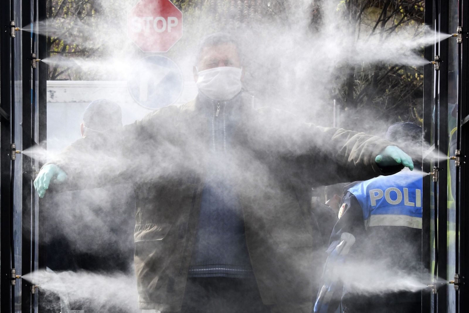 Một người đàn ông được phun thuốc khử trùng trước khi vào khu chợ ở Tirana, Albania hôm 6/4.