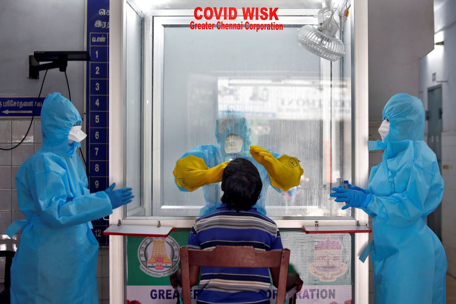 Bác sĩ kiểm tra cho bệnh nhân nghi nhiễm COVID-19 tại trạm kiểm dịch ở Chennai, Ấn Độ ngày 13/4.