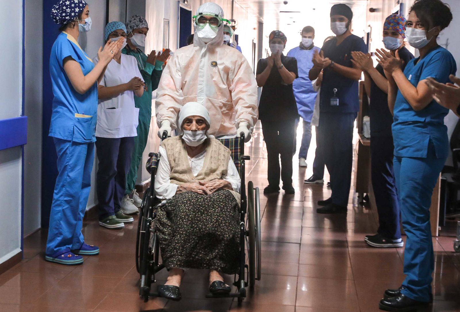 Các nhân viên y tế ở Istanbul, Thổ Nhĩ Kỳ vỗ tay chúc mừng cụ bà 107 tuổi Havahan Karadeniz đã vượt qua căn bệnh COVID-19. Hôm 13/4, bà đã được xuất viện.