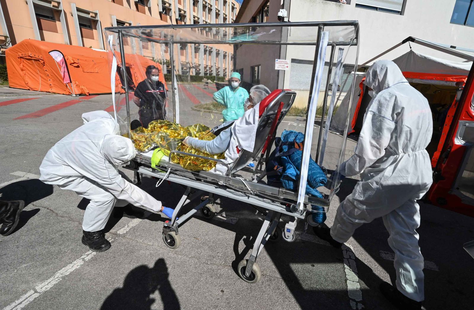 Nhân viên y tế chuyển bệnh nhân khỏi xe cấp cứu ở Montpelier, Pháp hôm 14/4.