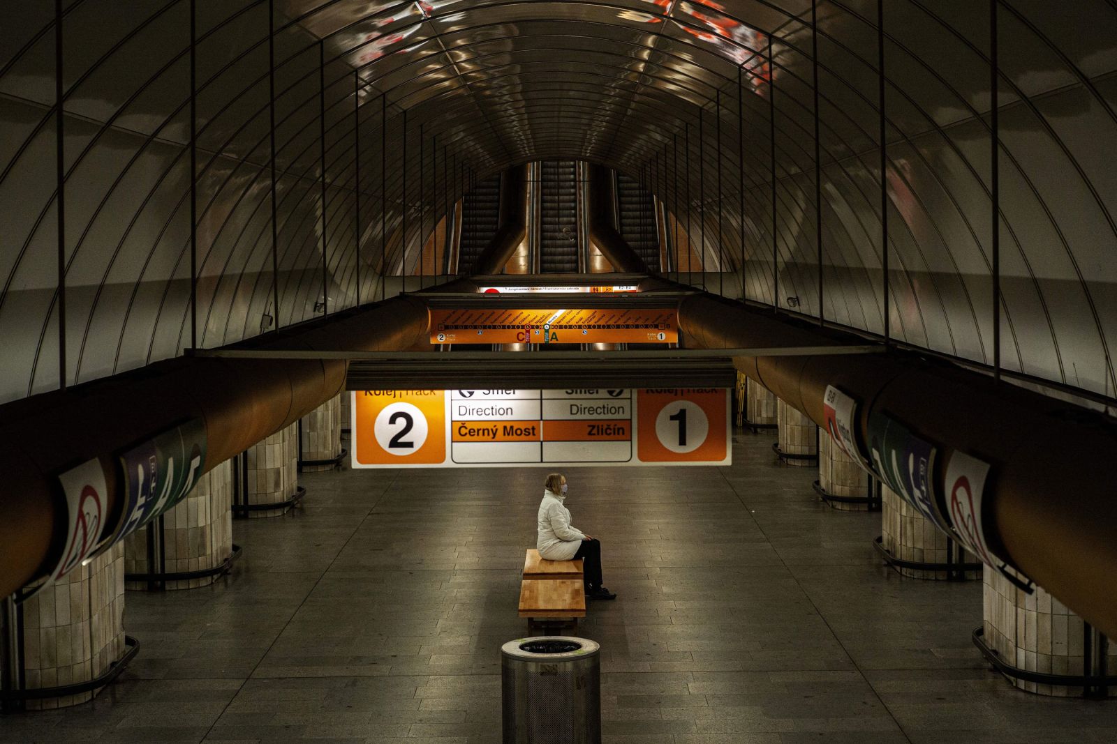 Người phụ nữ ngồi giữa ga tàu điện ngầm trống rỗng ở Prague, Cộng hòa Séc, ngày 15/4.