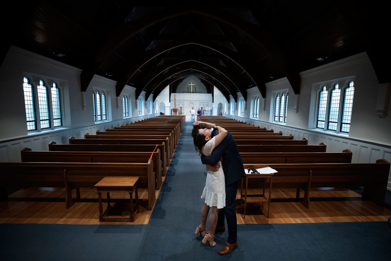 Tyler và Caryn Suiters trao nhau cái ôm sau lễ kết hôn tại Nhà thờ Thánh Mary ở Arlington, Virginia, Mỹ ngày 18/4. Mục sư Andrew Merrow và vợ ông là hai quan khách duy nhất tham gia buổi lễ này.