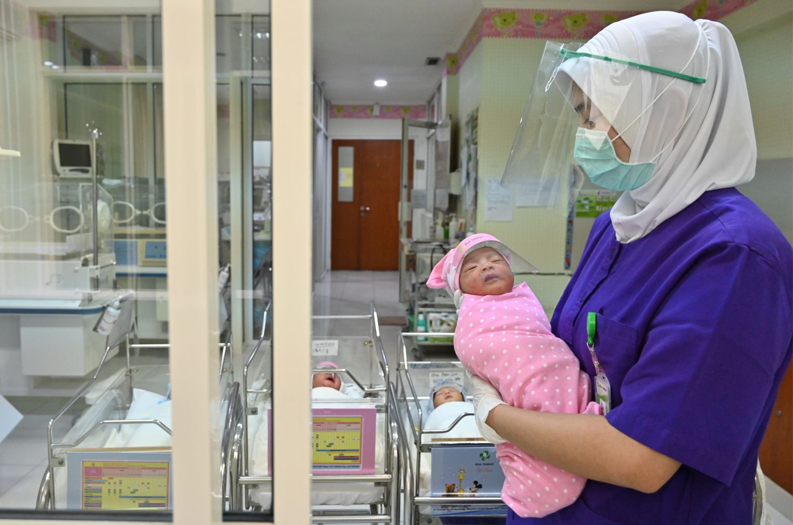 Một y tá bế em bé sơ sinh đeo khiên che mặt tại khoa phụ sản của một bệnh viện ở Jakarta, Indonesia, ngày 21/4.