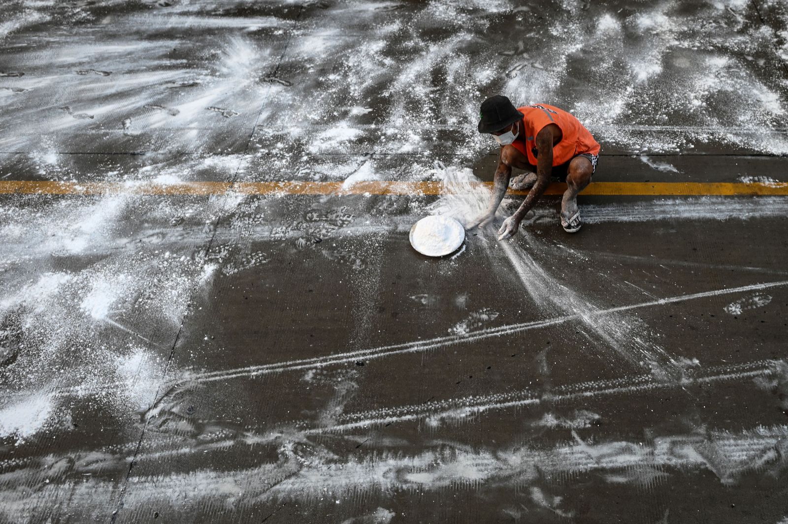 Một tình nguyện viên ở Yangon, Myanmar rải canxi oxit trên đường để ngăn ngừa virus lây lan, ngày 22/4. Đại dịch COVID-19 đã ảnh hưởng nặng nề tới đời sống, kinh tế thế giới.