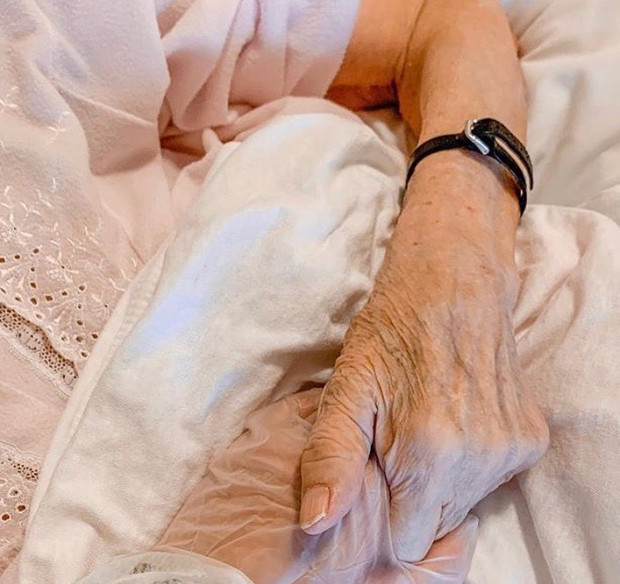 Y tá Ryan đang nắm tay một bệnh nhân tại viện dưỡng lão.