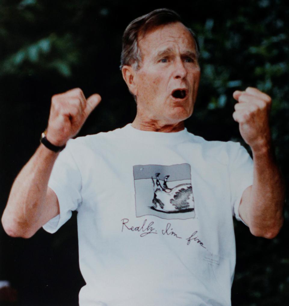 42. Ông George H.W. Bush đã góp phần sáng tạo ra một chữ cái Nhật Bản “Bushusuru”, có nghĩa là “hành động như ông Bush” ám chỉ khi ông đã bị nôn ngay trong bữa tối với Thủ tướng Nhật Bản năm 1992. Ảnh: REUTERS/Win McNamee.