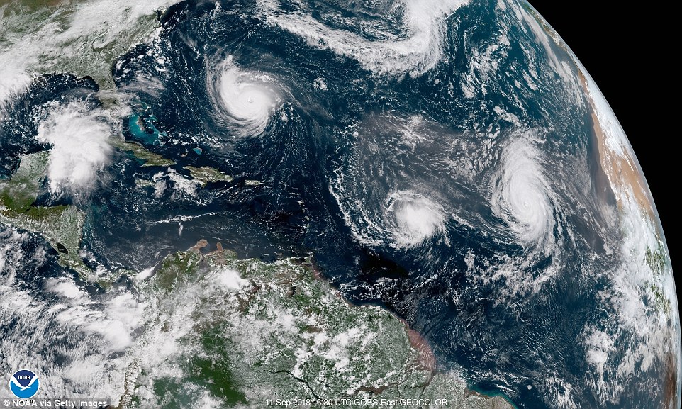 Hình ảnh vệ tinh do NOAA (Cơ quan Quản lý Khí quyển và Đại dương Quốc gia Mỹ) cung cấp, cơn bão Florence đổ bộ qua Đại Tây Dương, tiến về phía bờ Đông Mỹ, trước đó là các cơn bão Isaac và bão Helene.