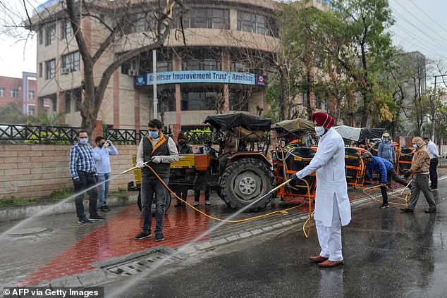 Các thành viên của Nghị viện Ấn Độ làm sạch đường phố để phòng chống sự lây lan của virus corona.