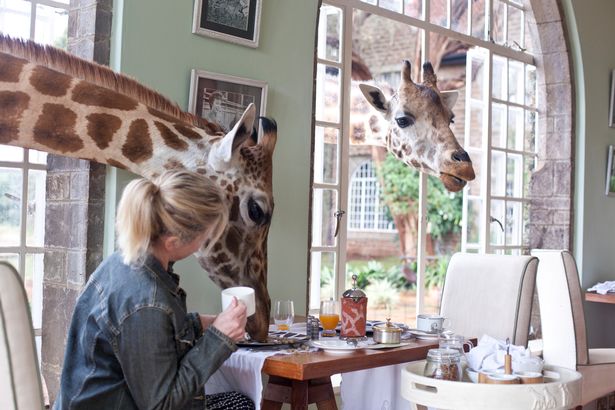 Đàn hươu cao cổ Rothschild thường thích việc đưa đầu vào phòng ăn qua cửa sổ trong khi những vị khách đang thưởng thức đồ ăn và mong rằng sẽ được cho những món ăn ngon lành.