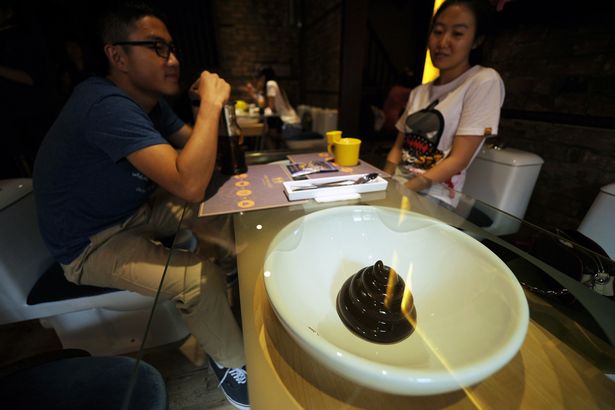 Trà sữa được đựng trong những chiếc cốc mang hình bệ tiểu, và kem socola được đặt trên những chiếc bát mang hình bồn cầu.