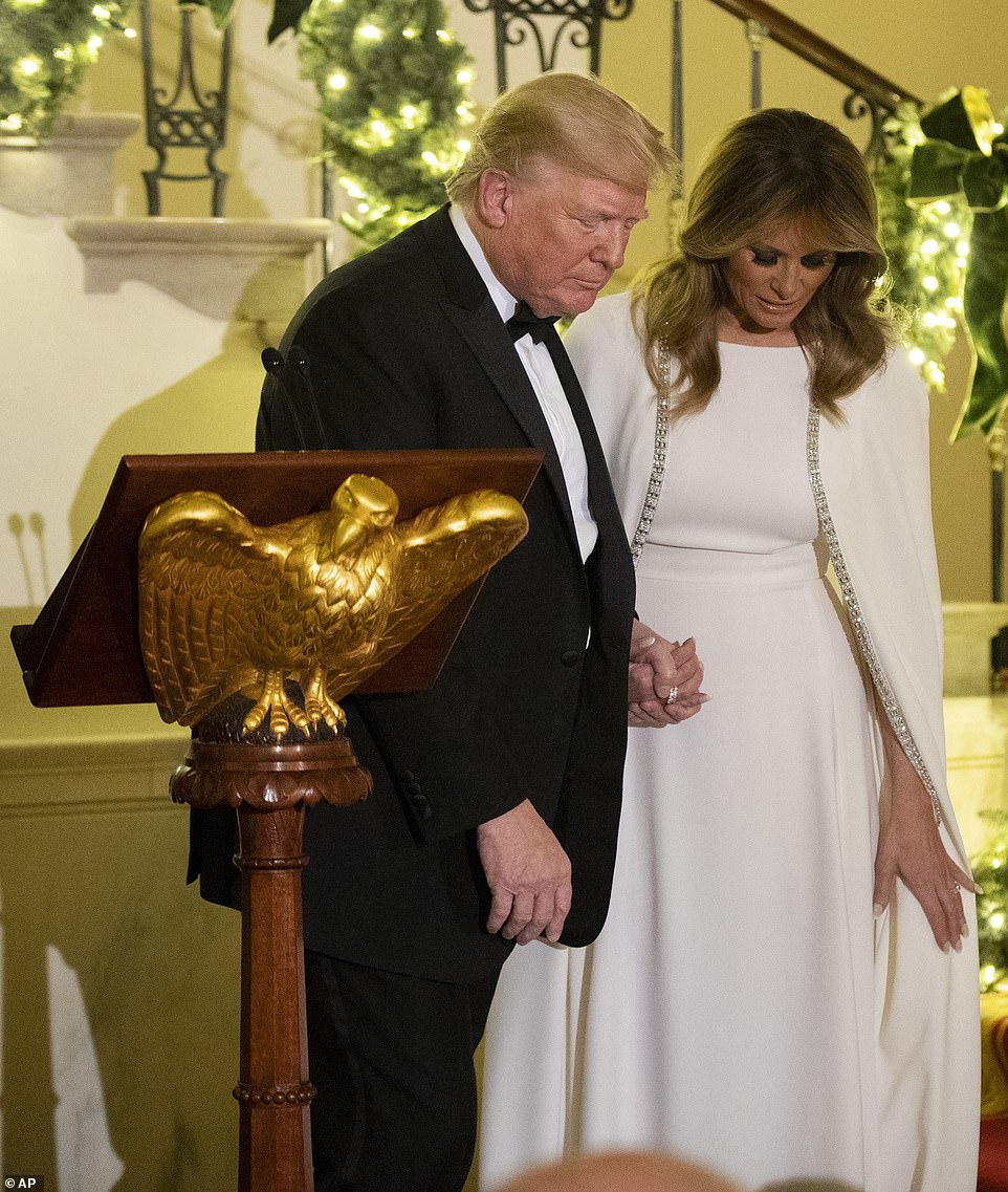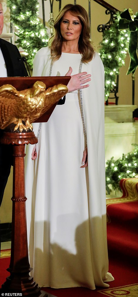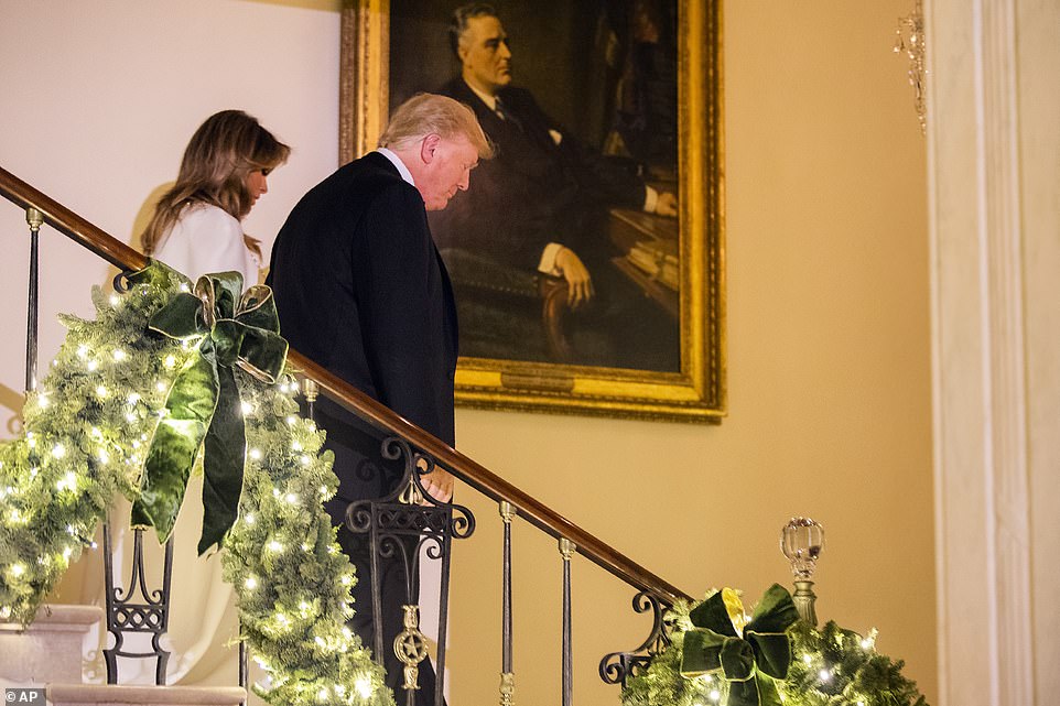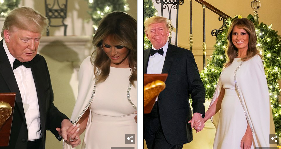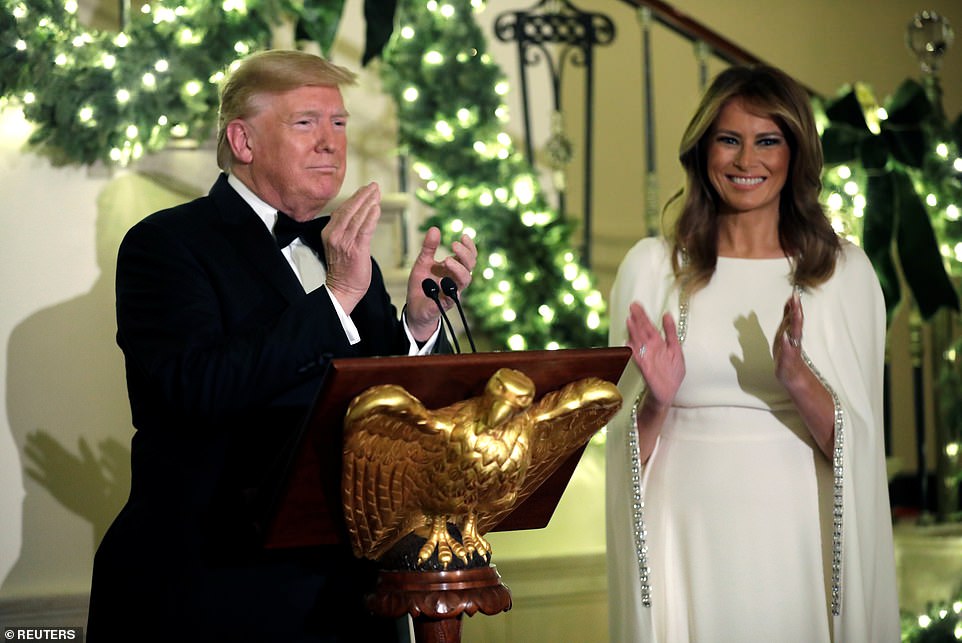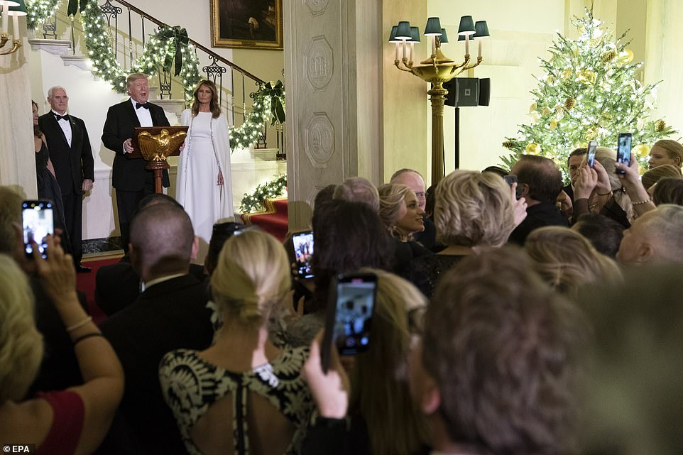 Đây không phải lần đầu tiên bà Melania chọn sắc trắng trong lễ mừng Giáng sinh. Năm ngoái, bà cũng cùng chồng tay trong tay đến sảnh Cross Hall trong chiếc váy ngắn cùng màu.