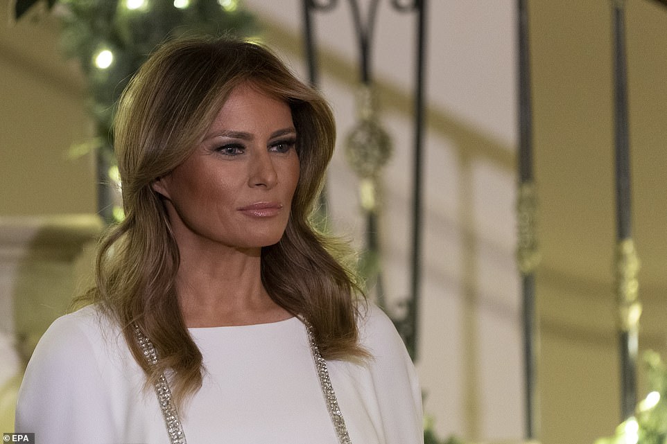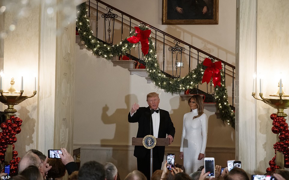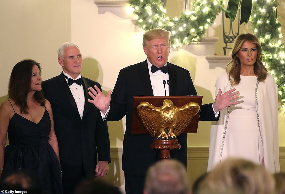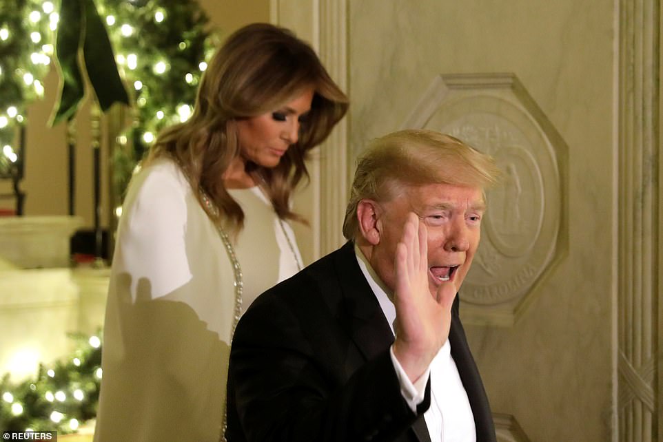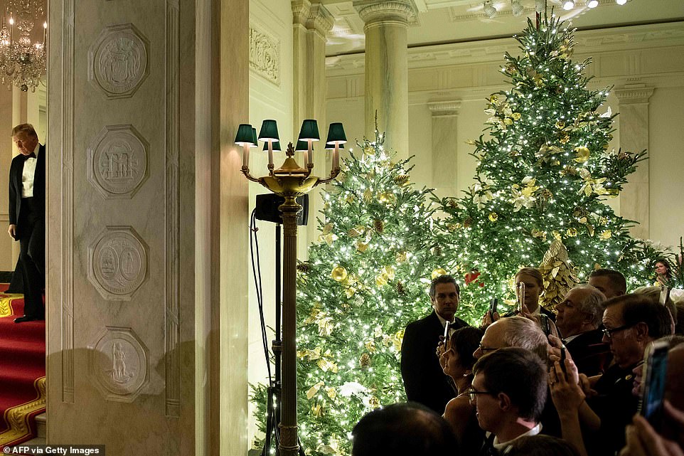 Đây không phải lần đầu tiên bà Melania chọn sắc trắng trong lễ mừng Giáng sinh. Năm ngoái, bà cũng cùng chồng tay trong tay đến sảnh Cross Hall trong chiếc váy ngắn cùng màu.