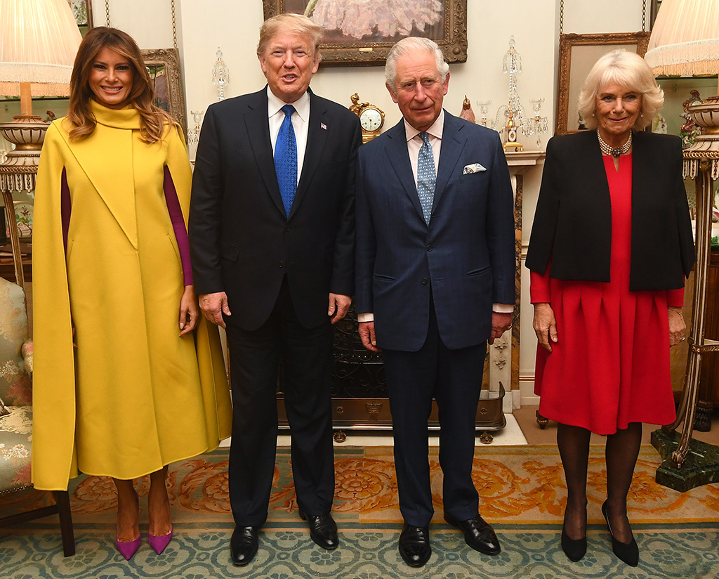Tổng thống mặc một bộ đồ màu đen, trong khi Thái tử Charles mặc một bộ đồ hải quân và bà Camilla chọn cho mình chiếc váy đỏ, áo khoác đen và ngọc trai.