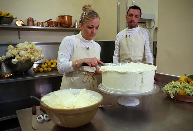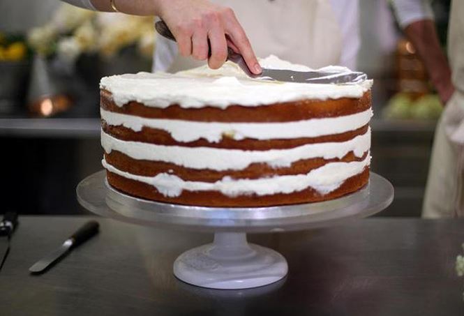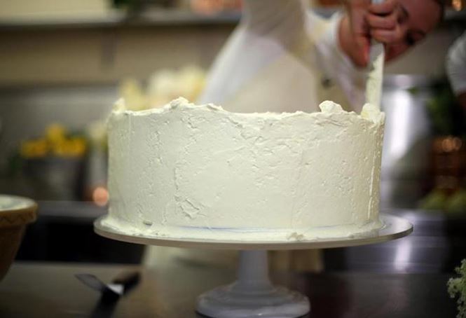 Bánh sẽ được để lên ray chờ nguội, sau đó phết kem trang trí. Claire Ptak cùng nhóm nhân viên 6 người đã làm việc liên tục toàn thời gian trong 5 ngày ở bếp bánh trong cung điện Buckingham. Cô Ptak là người Mỹ, sở hữu một tiệm bánh nhỏ ở đông London và thường sử dụng nguyên liệu hữu cơ theo mùa để làm bánh.