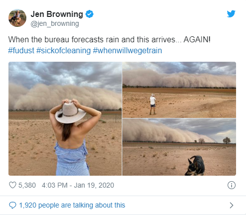Một tuần trước lúc bão bụi càn quét, khu vực này từng bị lũ cuốn qua sau thời gian dài hạn hán khiến cư dân không kịp trở tay. Biên tập viên đài ABC Jen Browning cho biết Cục Khí tượng đã dự báo cuối tuần này sẽ có mưa, nhưng trước khi ngày ấy đến, cô phải còng lưng dọn dẹp tầng bụi dày cộp tích tụ trong nhà.