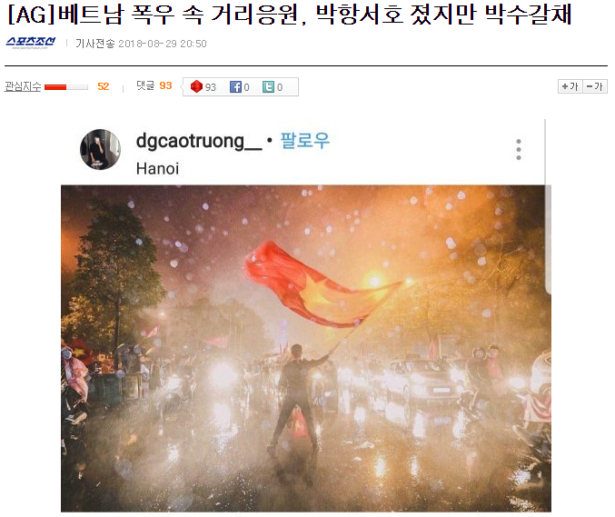 Tờ Chosun của Hàn Quốc nhanh chóng cập nhật tình hình tại Việt Nam. Chosun khá bất ngờ trước tình yêu mến mà các CĐV Việt Nam dành cho cầu thủ nước nhà. “Trên khắp các con phố tại Việt Nam, dù cho mưa rất lớn, các CĐV vẫn đổ ra đường để cổ vũ cho các cầu thủ. Khoảng 3-4 giờ trước khi trận đấu bắt đầu, người hâm mộ đã đổ ra đường, tập trung tại các khu vực có đặt màn hình lớn. Họ sẵn sàng mặc áo mưa, che ô để có thể xem rõ các cầu thủ thi đấu. Tuy thất bại trước Hàn Quốc, tuy nhiên, đây vẫn là lần đầu đội tuyển nước họ bước vào tứ kết ASIAD“, trích từ bài viết trên Chosun.