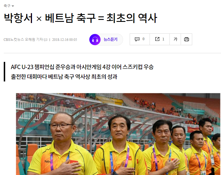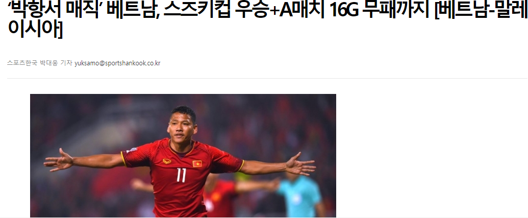 Tờ Chosun viết: “Vô địch AFF Cup 2018 là thành quả xứng đáng của Việt Nam dưới bàn tay của HLV Park Hang-seo. Họ đã giành chiến thắng 1-0 ở trận chung kết lượt về trước Malaysia. Sau hơn 10 năm chờ đợi, cuối cùng, thầy Park cũng mang lại niềm vui cho người hâm mộ bóng đá Việt Nam“. Còn SBS bình luận: “Đội tuyển Việt Nam đã đánh bại Malaysia 1-0 trong trận chung kết lượt về AFF Suzuki Cup 2018 và giành chức vô địch lần thứ hai trong lịch sử sau 10 năm chờ đợi. Điều này chứng tỏ sự mát tay của HLV Park Hang-seo, người mới có hơn một năm làm việc ở Việt Nam và ông đã mang về những sự thay đổi cho bóng đá quốc gia này”.