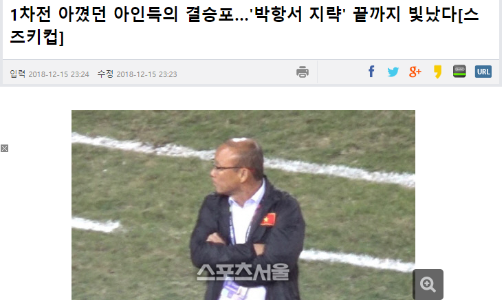 Ngay sau khi trận đấu kết thúc, một loạt các trang báo tại xứ sở kim chi đã đăng tải thông tin, chúc mừng ĐT Việt Nam, cũng như HLV Park Hang-seo, vị chiến lược gia tài ba, người giúp ĐT Việt Nam chạm tay chiếc cup vô địch AFF Cup sau 10 năm chờ đợi.