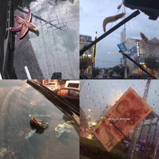 Những hình ảnh đáng kinh ngạc về cơn mưa hải sản được lan truyền một cách chóng mặt trên mạng xã hội Trung Quốc: Bạch tuộc, tôm sú, sao biển, sò huyết… rơi lộp độp xuống kính chắn gió xe ô tô của người dân Thanh Đảo. Thậm chí, có cả những tờ tiền 100 tệ bị gió cuốn mắc vào cần gạt nước…