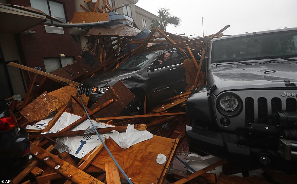 Người đàn ông cùng chiếc xe hơi mắc kẹt giữa đống đổ nát khi một khách sạn tại Panama City Beach bị hư hại nặng nề do gió bão. Ảnh: AP