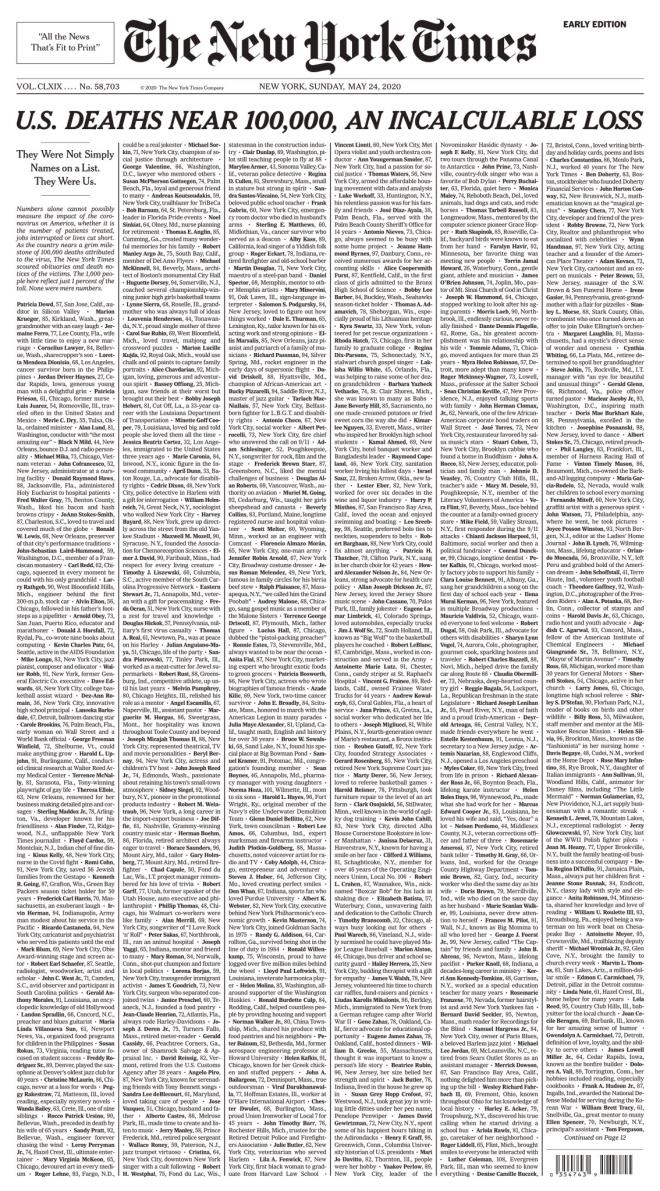 “Chỉ riêng những con số thống kê thôi thì chẳng thể đo lường được tác động của virus corona tới nước Mỹ, dù đó có là số bệnh nhân được điều trị, số công việc bị gián đoạn hay những cuộc sống bị cắt ngắn. Khi đất nước tiến gần cột mốc 100.000 người chết vì virus, New York Times đăng các cáo phó và thông báo về cái chết của các nạn nhân”, Ban biên tập tờ báo viết.