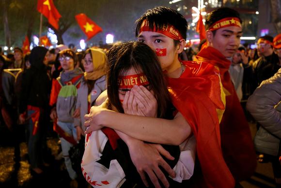 Cổ động viên ở Hà Nội buồn bã khi đội tuyển để thua vào phút chót trong trận chung kết với Uzbekistan. Ảnh: Reuters