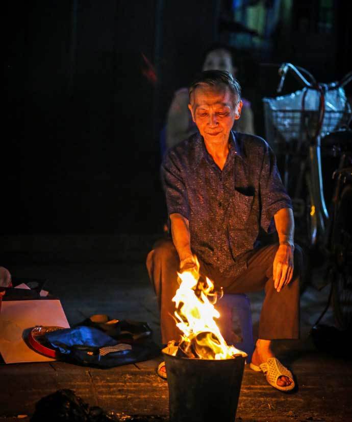 Trở lại khu phố cổ của Hà Nội, tôi gặp ông Trần Quốc Việt, 68 tuổi, cũng đang đốt vàng mã cho tổ tiên.