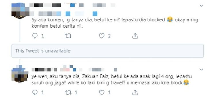 Một cư dân mạng bức xúc “tố” Zakat chặn mình khi cô hỏi đến những đứa con của anh ta: “Tôi chỉ tweet để hỏi xem gã có thấy áy náy khi bỏ 4 đứa con sống với người khác không. Chưa đến 10 phút sau, tôi bị chặn trên mọi mặt trận”.
